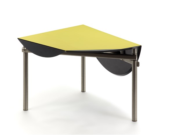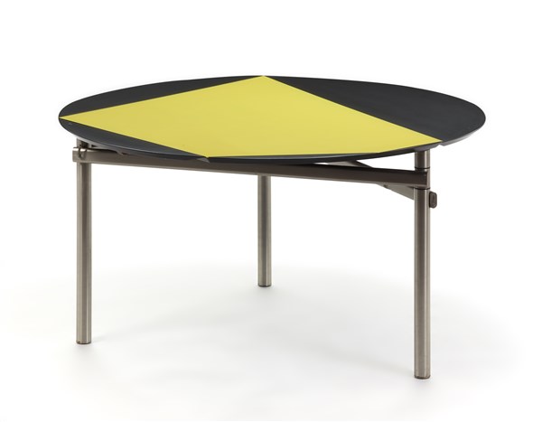 Tavolo da pranzo della collezione ABV. Produzione Tecno, Varedo, 1983-1991. Struttura in tubolare d'acciaio cromato, piano ripiegabile in legno laccato nero e giallo. Targhetta metallica del produttore. (h cm 72,5; d cm 139) (lievi difetti e piccole mancanze)