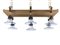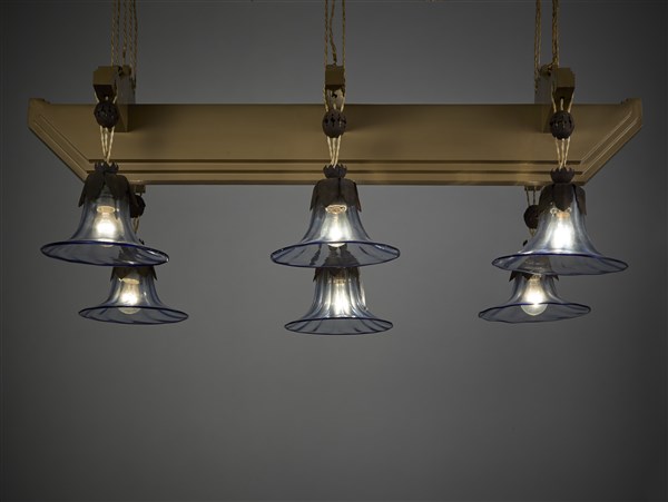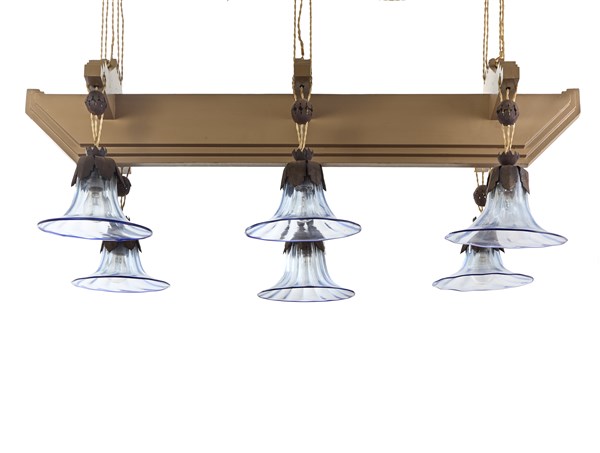 Lampada a sospensione Déco a sei luci. Milano, 1925ca. Legno massello verniciato beige, sei diffusori a campanula in vetro soffiato di Murano trasparente blu, bordato in blu opaco. Montature a foglia in ferro battuto. (l cm 125) (lievi difetti)