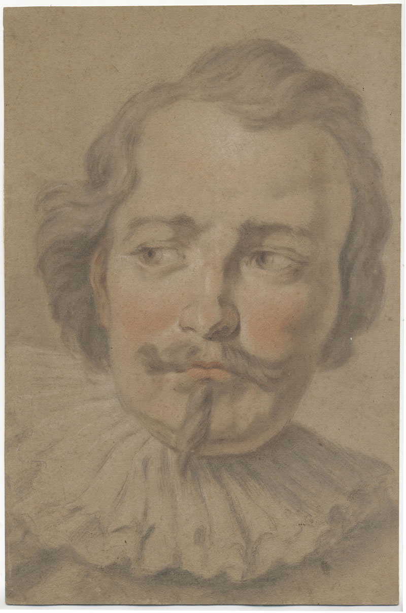Louis Renè Vouet (1637-1675) [attribuito a]. Ritratto virile. XVIII secolo. Matita nera e pastello rosa, marrone e bianco; carta avorio-beige. Foglio: mm 387x257. Questo bel ritratto, di notevoli dimensioni, è stato già convincentemente confrontato con il cosiddetto Autoritratto di Simon Vouet a pastello degli Uffizi (inv. 1890, n. 4298), opera in passato attribuita anche a Domenico Tempesti e poi ricondotta a Luois Renè Vouet, figlio del più noto Simon (cfr. E. Negro in CENTO DISEGNI, 1998, n. 43, p.100). Sul verso è presente un timbro della collezione di Christian Gottfried (LUGT 2871).    In ottime condizioni di conservazione, a parte lievi macchie diffuse; è controfondato, ossia interamente incollato a un foglio di carta bianca vergellata.