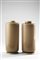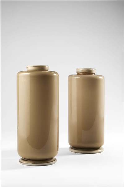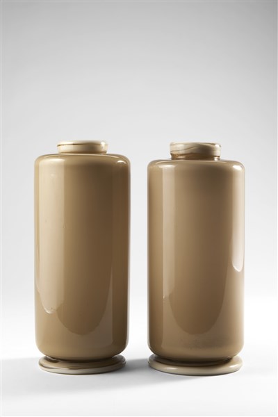 Coppia di vasi in vetro incamiciato lattimo e pagliesco. Esecuzione Venini, Murano, 1932-33. Corpo cilindrico, piccolo piede svasato e bocca ad anello in vetro lattimo e pagliesco. Disegno 3297 del Catalogo Blu. Firmati all'acido sotto la base "venini murano". (h cm 26)
