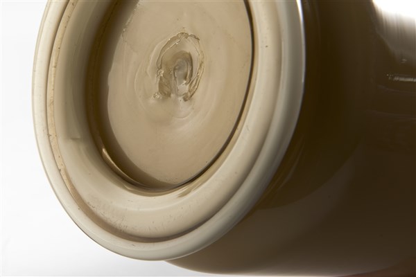 Pair of vases in lattimo and pagliesco incamiciato glass. Execution by Venini, Murano, 1932-33. Cylindrical body, small flared foot, and ring spout in lattimo and pagliesco glass. Drawing 3297 in the Blue Catalog. Signed under the base "venini murano". (h 26 cm.)