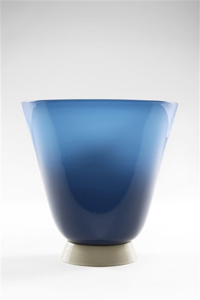 Vaso in vetro incamiciato blu. Esecuzione Venini, Murano, 1932ca. Corpo troncoconico con base applicata a caldo in vetro incamiciato pagliesco chiaro. Disegno n. 3307 del Catalogo Blu. Firmato all'acido sotto la base "venini murano". (h cm 22)