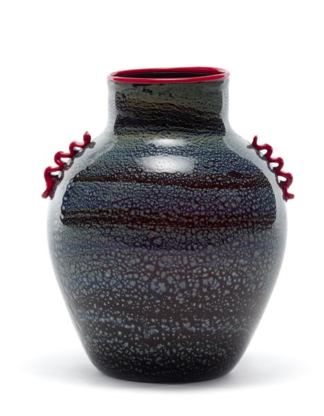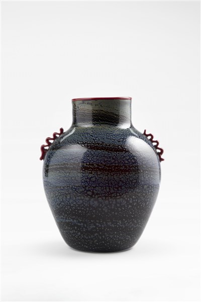 Vaso a morise in vetro soffiato ametista scuro con applicazione di foglia d'argento e ossidi metallici nei toni del grigio azzurro. Orlo del collo e morise applicati a caldo in pasta di vetro rossa. Esecuzione Cirillo Maschio & C, Murano, anni '20/'30. (h cm 23)