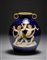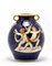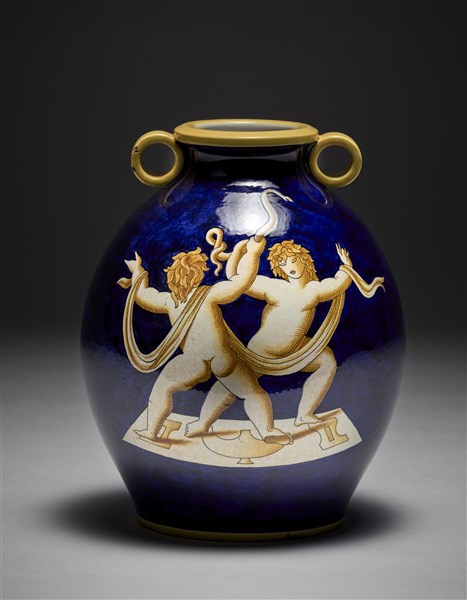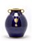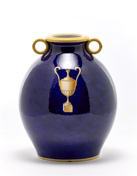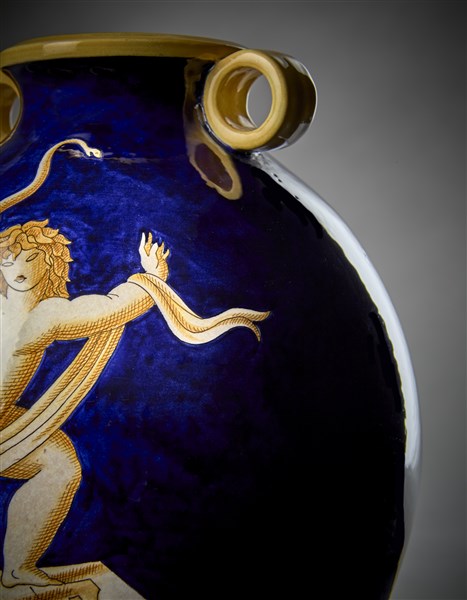 Double-handle jar with hoop handles. Manufacture of Richard Ginori, Doccia (Florence), 1924ca. Mold-formed majolica, hand-painted under glass, with blue background and classical ochre and black figuration. On opposite side decoration depicting ochre and black double-handle amphora. Vase form no. 969, decoration no. 236E. Inscribed under the base "Richard Ginori" with crown monogram, numerals "M969/236E" and signature "Gio Ponti". (h 23.5 cm.) (slight defects)