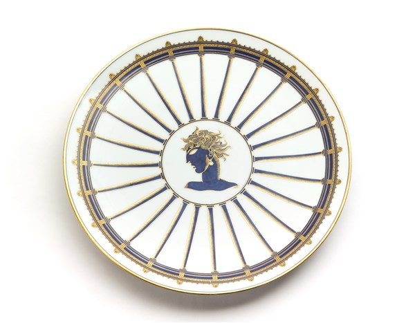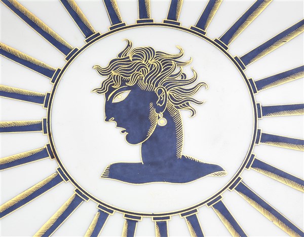 Plate of the series "La passeggiata archeologica". Manufacture of Richard Ginori, Pittoria di Doccia, 1924. White porcelain decorated with gold chrome and hand-painted in blue Ponti. Marked on verso with gold cartouche of Pittoria di Doccia, "Richard Ginori" and numerals 29 = 6 in green. (d 33 cm.) (slight defects)