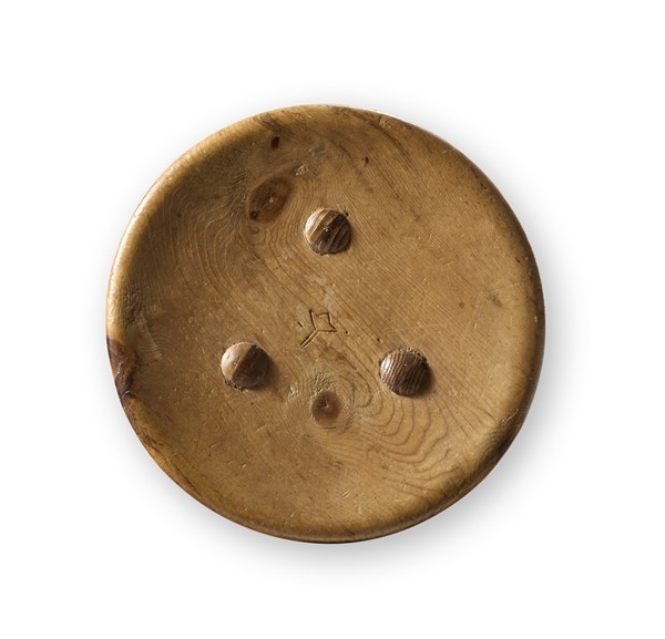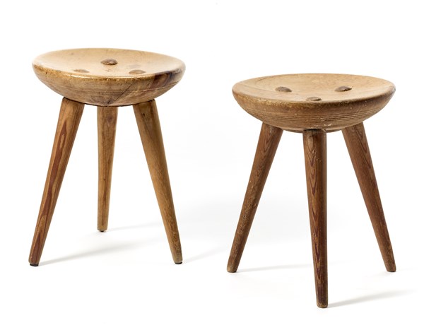 Pair of stools for the Pirovano refuge hotel in Cervinia. Produced by Poggi, Pavia, 1951ca. Solid fir wood. Circular bowl-shaped seat with grooves on the underside. Three truncated con legs inserted in spine. (h 45 cm.; d 35 cm.) (defects)