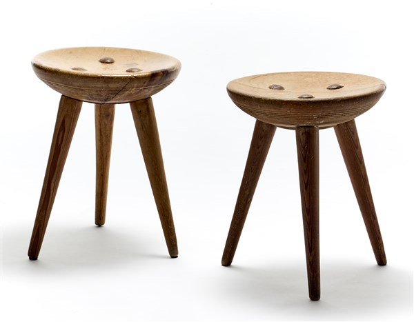 Coppia di sgabelli per l'albergo rifugio Pirovano di Cervinia. Produzione Poggi, Pavia, 1951ca. Legno di abete massello. Seduta circolare sagomata a ciotola con scanalature sul lato inferiore. Tre gambe troncoconiche inserite a spina. (h cm 45; d cm 35) (difetti)