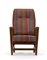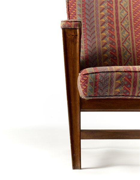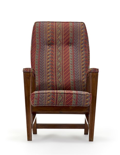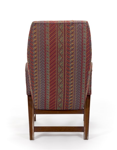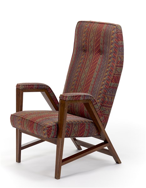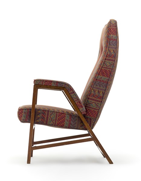 Poltrona da lettura. Pezzo unico. Milano, 1951. Struttura a cavalletto in legno massello di mogano, rivestimento non coevo in tessuto policromo Missoni nei toni preminenti del rosso, del ciclamino, dell'arancio e del giallo. (cm 66x111x64,5) (lievi difetti)