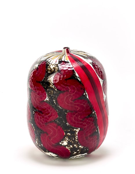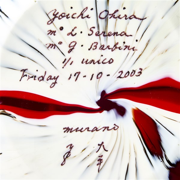 Vaso con corpo cilindrico leggermente a zucca e colletto troncoconico. Esecuzione Livio Serena e Giacomo Barbini, Murano, 2003. Vetro soffiato composto da: due a fasce verticali tripartite in pasta vitrea rossa e vetro rosso trasparente lavorate alla mola con leggere scanalature verticali; sei settori a volute ottenute da grandi murrine a "C" alternate, in vetro trasparente rosso e lattimo, con superficie sfaccettata alla mola; inserti in polveri nere e avventurina. Parte sommitale in vetro trasparente pagliesco, lattimo e rosso inciso alla mola. Orlo in pasta vitrea nera. Pezzo unico. Firmato e datato a punta sotto la base "Yoichi Ohira, m° L. Serena, m° G. Barbini, 1/1 unico, Friday 17-10-2003, Murano", monogramma dell'artista. (h cm 23)