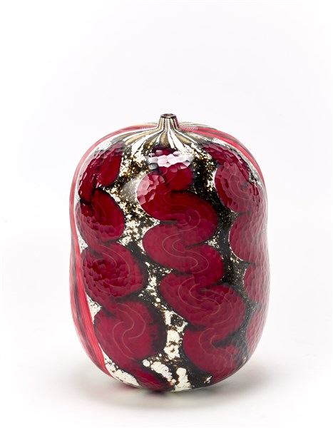 Vase with slightly cylindrical pumpkin body and truncated cone collar. Execution by Livio Serena e Giacomo Barbini, Murano, 2003. Blown glass composed of: two tripartite vertical bands in red glass paste and transparent red glass; six volute sectors obtained from large "C" alternating murrines, in transparent glass red and lattimo, with faceted surface at the wheel; black powder and aventurine inserts. Top part in clear, lattimo and red glass engraved. Edge in black glass paste. Unique piece. Signed and dated under the base "Yoichi Ohira, m° L. Serena, m° G. Barbini, 1/1 unico, Friday 17-10-2003, Murano", artist’s monogram. (h 23 cm.)