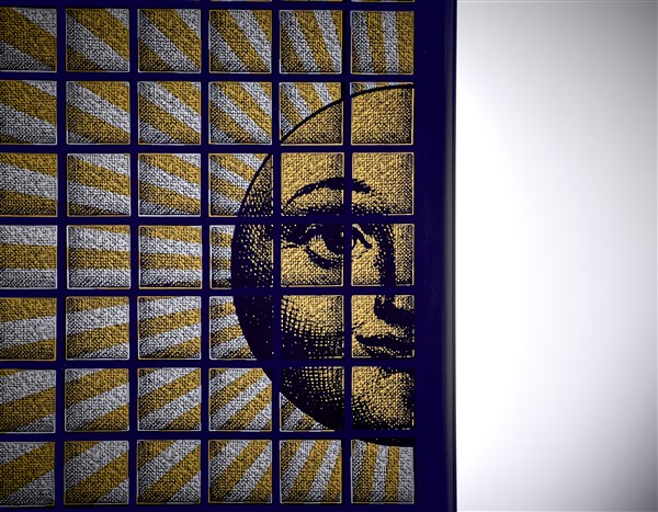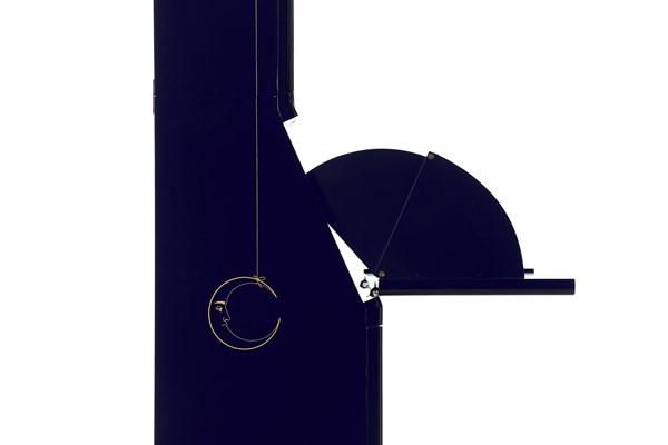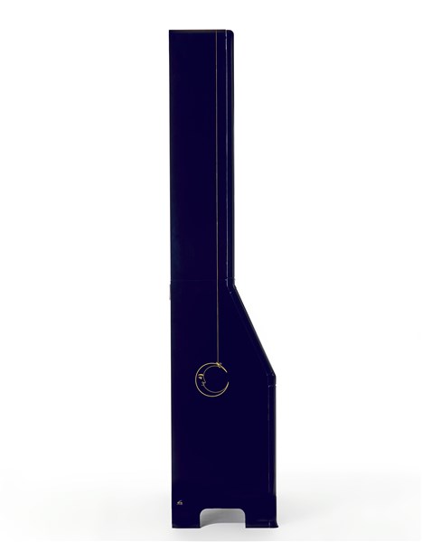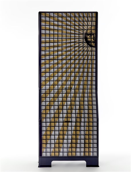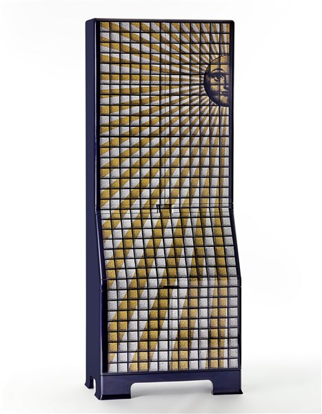 Mobile contenitore. Milano, 1999. Struttura in legno laccato blu notte, con decori a stampa in argento, nero e oro raffiguranti sul fronte il sole e uno sfondo architettonico a quadrati, sui fianchi la luna. Interni con ripiani in legno. Firmato, numerato e datato alla base sul lato "FORNASETTI - MILANO / MADE IN ITALY / ESEMPLARE 1 DI 2 / 1999". (cm 86x219x48)