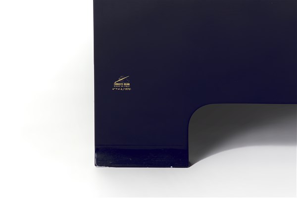 Storage cabinet. Milan, 1999. Blue lacquered wood structure with silver, black and gold printed decorations depicting the sun and a square architectural background on the front, the moon on the sides. Interior with wood shelves. Signed, numbered and dated at the base on the side "FORNASETTI - MILANO / MADE IN ITALY / ESEMPLARE 1 DI 2 / 1999". (86x219x48 cm.)