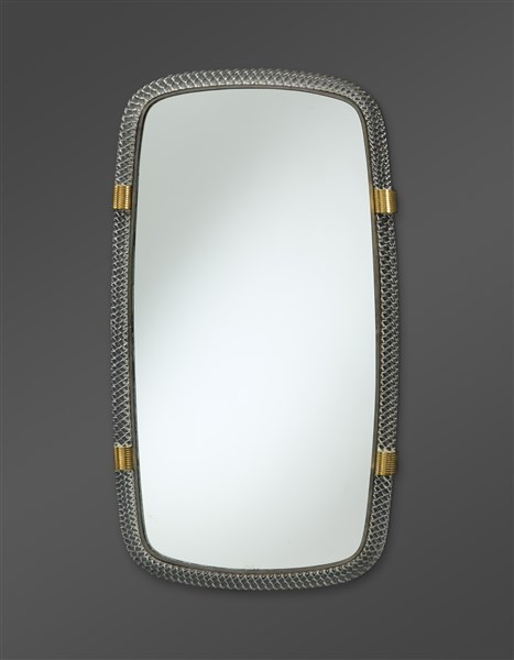 Mirror. Murano, 1930s. Braided crystal blown glass frame, brass frame. Drawing no. 20 in Catalogo Blu Venini. Engraved mark "VENINI MURANO". (69x128 cm.) (slight defects)