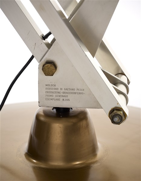 Derivato dalla moltiplicazione per quattro della lampada "Luxo L 1" della Jac. Jacobsen di Oslo. Marcato a incussione: "MOLOCH / RIDISEGNO DI GAETANO PESCE / PRODUZIONE - BRACCIODIFERRO - / PRIMO CENTINAIO / ESEMPLARE N. 005. (in posizione normale, come nella foto: h cm 230, l cm 312, diam calotta cm 65, diam base cm 86, peso 140 kg) (lievi difetti, mancante del globo diffusore in vetro lattimo)