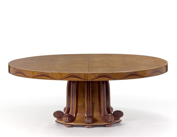 Maurice Dufrène Tavolo allungabile con piano ovale impiallacciato e intarsiato c