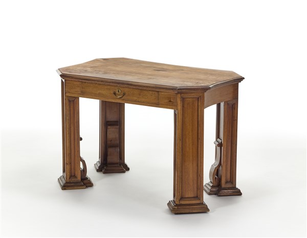 Solid veneered wood with a drawer, shaped uprights on frame bases. Italy, 1908ca. (115x79x72 cm.) (slight defects)