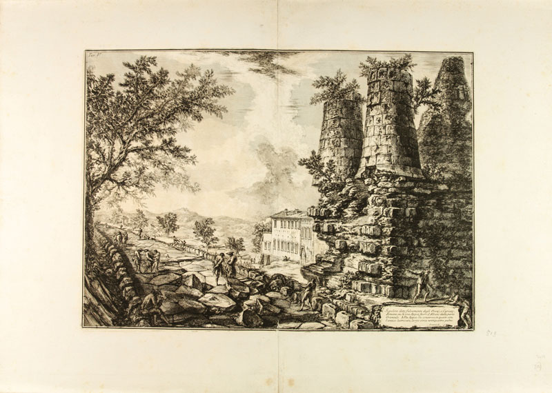 Giovanni Battista Piranesi (1720-1778). Sepolcro detto falsamente degli Orazj, e Curiazj. Rimane su la via Appia fuori d’Albano dalla parte Orientale. 1764. Acquaforte mm 386x549. Margini mm 544x786. Titolo in basso a destra nell'incisione con sotto indicazioni dei luoghi e sotto : 'Piranesi F.' Acquaforte tratta dalle 'Antichità di Albano e di Castel Gandolfo', Tav. V. Focillon, 513. Buone condizioni generali con lievi aloni e consueta piega centrale.