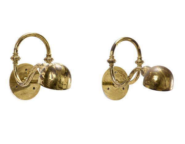 Coppia di lampade da parete con braccio snodabile e riflettore orientabile modello "LP15 Tromba". Produzione Azucena, Milano, 1964. Ottone lucidato. (l cm 46) (lievi difetti)