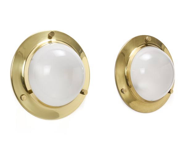 Coppia di plafoniere-appliques grandi modello "LSP6 Tommy". Produzione Azucena, Milano, 1965. Struttura in ottone lucidato, paralume in vetro smerigliato internamente. (d cm 42) (lievi difetti)