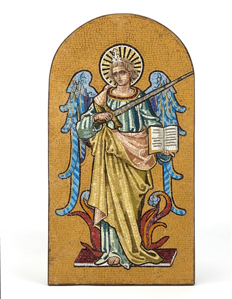 Mosaic with polychrome glass tiles depicting Saint Michael the Archangel. Mounted on panel. Venice, first half 20th century. Adhesive label "Pauly & C.". (61x113x3 cm.) (slight defects)