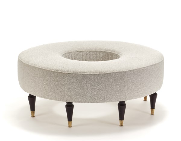 Divano da centro imbottito a ciambella con rivestimento in bouclé bianco, piedini in legno con puntali in ottone. Italia, anni '50. (cm 111x43x111) (lievi difetti e restauri)