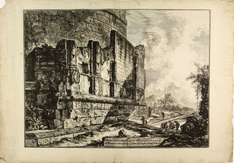 Giovanni Battista Piranesi (1720-1778). Veduta degl’ avanzi del sepolcro della famiglia Plauzia sulla via Tiburtina vicino al ponte Lugano due miglia lontano da Tivoli. Acquaforte mm 462x622. Margini mm 540x778. Titolo in basso al centro. A sinistra in basso si legge 'Cavalier Piranesi F.' Buon esemplare con solo qualche lieve traccia di foxing ai margini e un piccola mancanza al margine in alto a sinistra. Hind, 83 I stato/III.