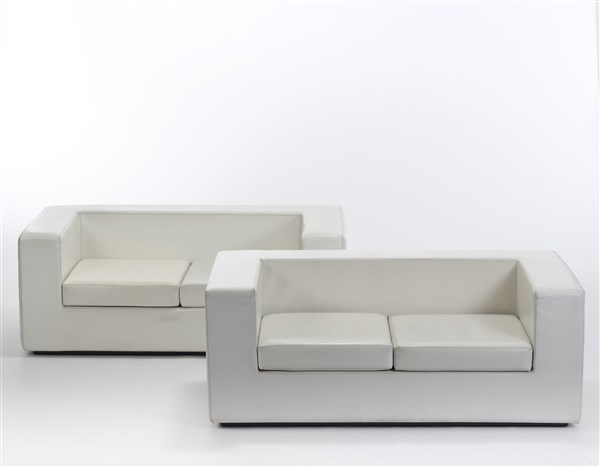 Pair of sofas from the first series model "Throw Away". Produced by Zanotta, Nova Milanese, 1965. White leatherette. Marked below the base. (148x58x76 cm.) (slight defects)