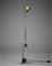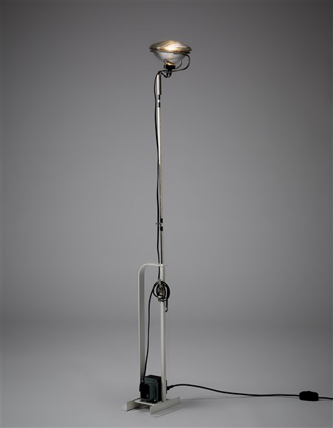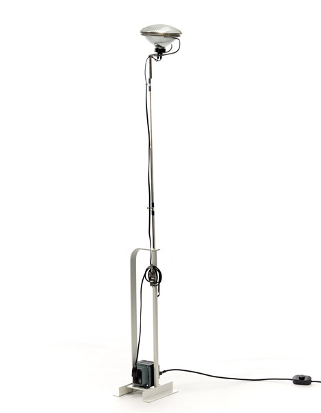 Lampada da terra modello "Toio". Produzione Flos, Milano, 1962. Base in metallo verniciato bianco, fusto in metallo cromato. Recante etichetta adesiva del produttore. (altezza regolabile)
