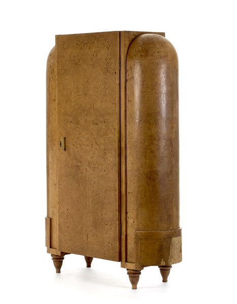 Deco light briar veneered closet cabinet with central door and curved sides with domed finials, turned feet, metal and bakelite handles. Italy, 1930s. (123x187x50 cm.) (major defects and losses)