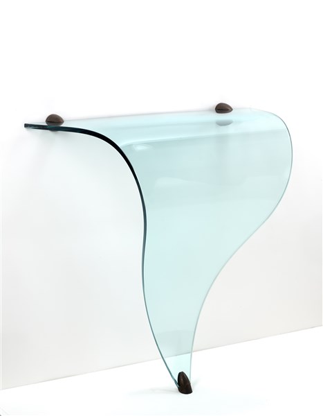 Consolle in cristallo curvato e molato sagomato a triangolo, borchie di fissaggio in ottone e metallo. Italia, 1991. Firmata e datata a punta sul fianco. (h cm 90) (difetti)