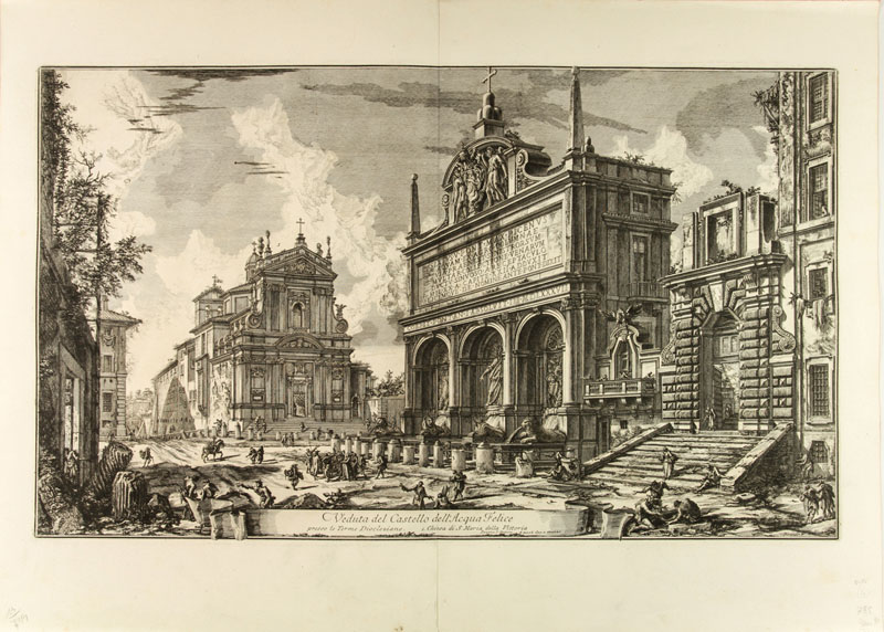 Giovanni Battista Piranesi (1720-1778). Veduta del Castello dell’Acqua Felice. Acquaforte mm 408x690. Margini mm 542x755. In basso al centro, sotto il titolo, si legge: 'Presso l'autore. A paoli due e mezzo'. Nell'angolo destro si legge 'Piranesi F.' Consueta piega centrale ma bell'esemplare in ottima inchiostrazione. Hind,20 II stato/V.