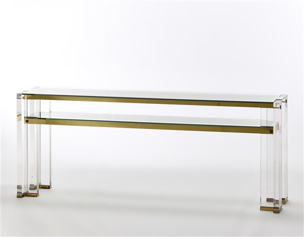 Console table with brass and plexiglass structure, with two crystal shelves. Italy, 1970s. (200.5x81x44 cm.) (defects)