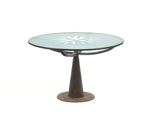 Tavolo modello "Astrolabio". Produzione Driade, Italia, anni '60. Base in metallo brunito, piano in cristallo parzialmente acidato decorato con elementi stilizzati. (h cm 73; d cm 114) (difetti)