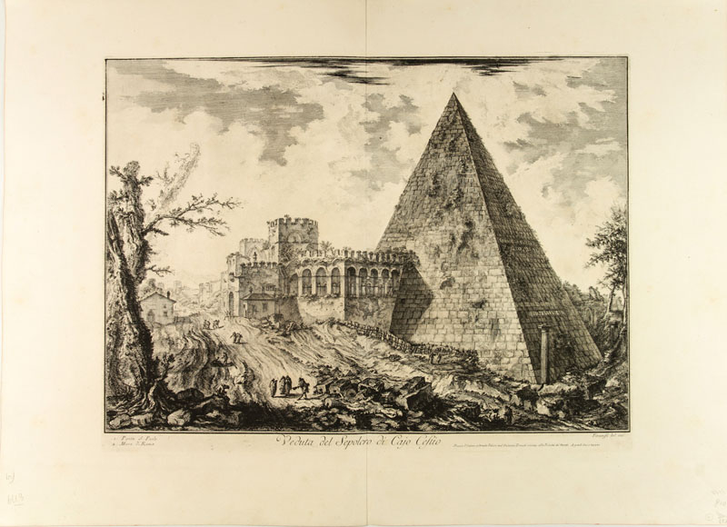 Giovanni Battista Piranesi (1720-1778). Veduta del Sepolcro di Cajo Cestio. Acquaforte mm 405x545. Margini mm 540x753. Titolo in basso al centro. In basso a destra 'Piranesi del. inc.' Sotto sempre in basso a destra 'Presso l'autore a Strada Felice nel Palazzo Tomati vicino alla Trinità de' Monti. A paoli due e mezzo'. Consueta piega centrale ma buona condizione generale. Hind, 35 III stato/VI.