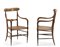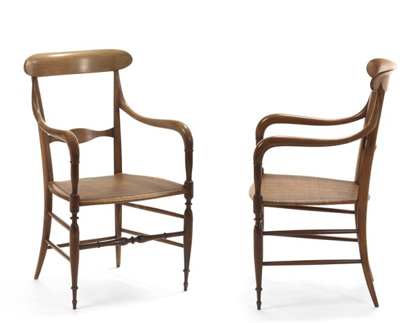 Coppia di poltroncine modello "Campanino". Produzione, Chiavari, anni '60. Legno di faggio tinto, seduta impagliata. Lacerti di etichetta. (cm 51x88x46) (lievi difetti)
