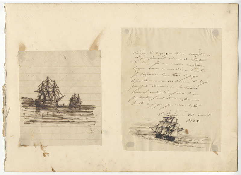 Anonimo francese del XIX secolo. Velieri. Lotto composto da 2 fogli contenenti vari disegni di velieri (a penna e inchiostro marrone), alcuni affiancati dal nome dell'imbarcazione. Completa il lotto una lettera datata 1838, in calce alla quale è disegnato un altro veliero. I tre fogli, che recano alcuni piccoli difetti, sono parzialmente incollati a fogli di supporto.