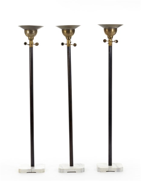 Tre lampade da terra a tre luci. Milano, anni '40/'50. Fusto in metallo verniciato e ottone, base in marmo bianco di carrara, diffusore luminator con ghiera metallica scalettata. (h cm 176) (difetti)