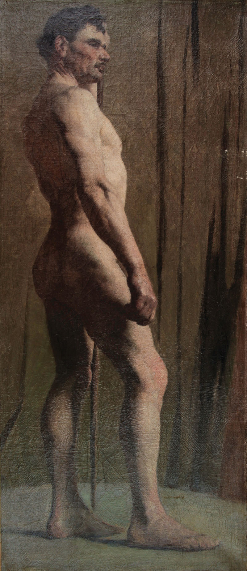 Pittore modenese della seconda metà del XIX secolo.. Due studi di nudi virili accademici. 1880 ca. Olio su tela. Mm 810x350. Le due opere, condotte forse dalla stessa mano, si collocano nell'ambito degli studi accademici di nudo maschile. Tuttavia, la pennellata brillante, minuta ma sfrangiata, unita al particolare interesse luministico, evidente soprattutto nel nudo di spalle, ne collocano l'esecuzione nella seconda metà del XIX secolo in un ambito modenese romagnolo vicino a Giovanni Muzzioli (1854-1894) o Angelo Torchi (1856-1915). In ottimo stato di conservazione.