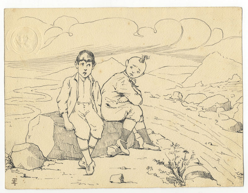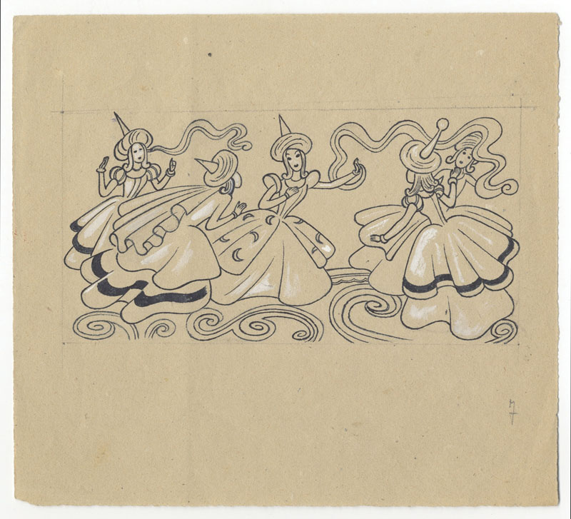 Bruno Angoletta (1889-1954). Girotondo di fate. China con lumeggiature a biacca su carta avana mm. 175x195. Unito: Mussino Attilio (Torino 1878-Cuneo 1954). Il più bel regalo. China mm.140x90. Firmato in basso: "Attilio". Unito: ET, Zucchino e Pepino. China mm. 165x215. Siglato col monogramma (non identificato) "ET" in basso a sinistra. In alto a sinistra timbro a secco. Al verso a matita: "Zucchino e Pepino seduti su di un grosso sasso. Capitolo 8°". -
