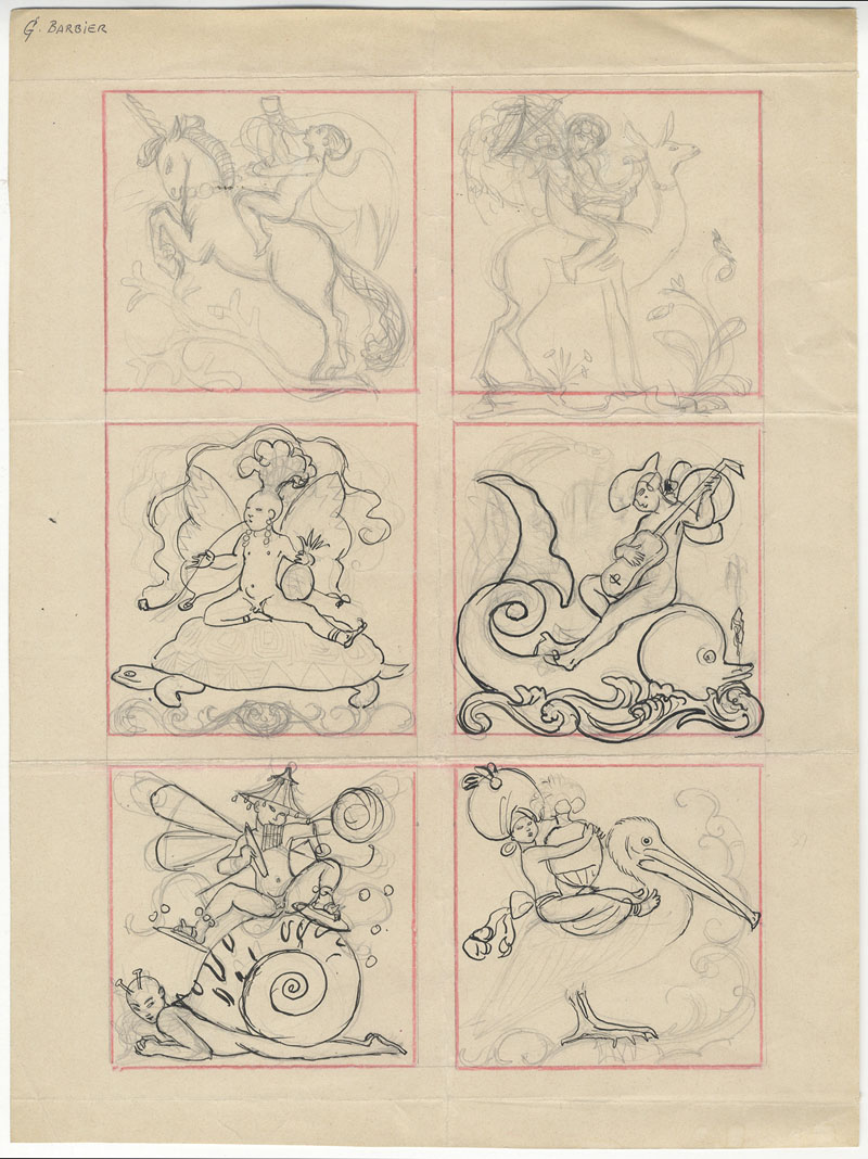 George Barbier (1882-1932). Scherzi di putti e animali. 1920 ca. Composizione di sei vignette a penna, inchiostro di china e matita di grafite, riquadrate in rosso, con putti variamente abbigliati che cavalcano differenti animali. mm 315x235. Scritta a penna in alto a sinistra: «G. Barbier». -