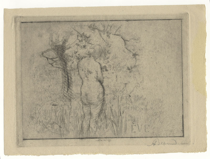 Paul Albert Besnard (1849-1934). Eve de dos devant le pommier. 1892. Puntasecca. mm 175x235. Foglio: mm 197x272. Delteil, 101. Coppier, 88. Firmata sulla lastra e a matita in basso a destra. II stato su 2. Bella impressione stampata, con forte effetto plate-tone, su carta pesante con filigrana "Ancora". Ampi margini, lieve traccia di ingiallimento al margine destro bianco, per il resto ottima conservazione.