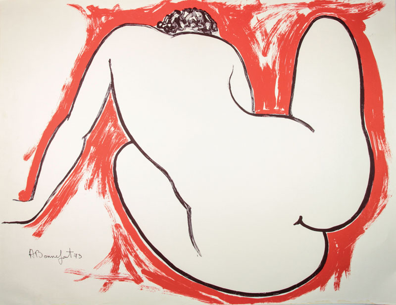 Alain Bonnefoit (1937-? ). Nudo di schiena. 1973. Tempera rossa e nera su carta avorio. mm 700x905. Firmata e datata in basso a sinistra. Lievissima sgoratura al margine inferiore.