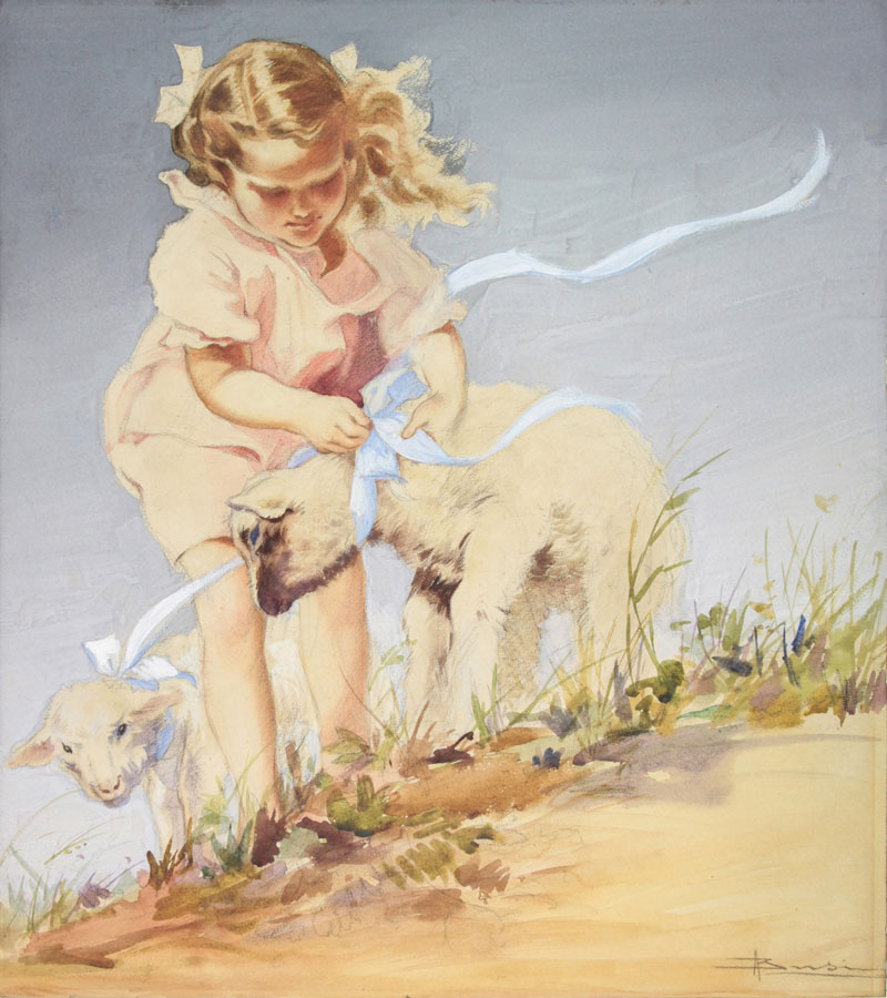 Adolfo Busi (1891-1977). Fanciulla con agnellini. 1930 ca. Acquerello policromo e tracce di carboncino su carta pesante. mm 500x445. Firmato in basso a destra. Lievi fioriture al verso ma che non interessano il disegno. In passe-partout. Ottima conservazione.