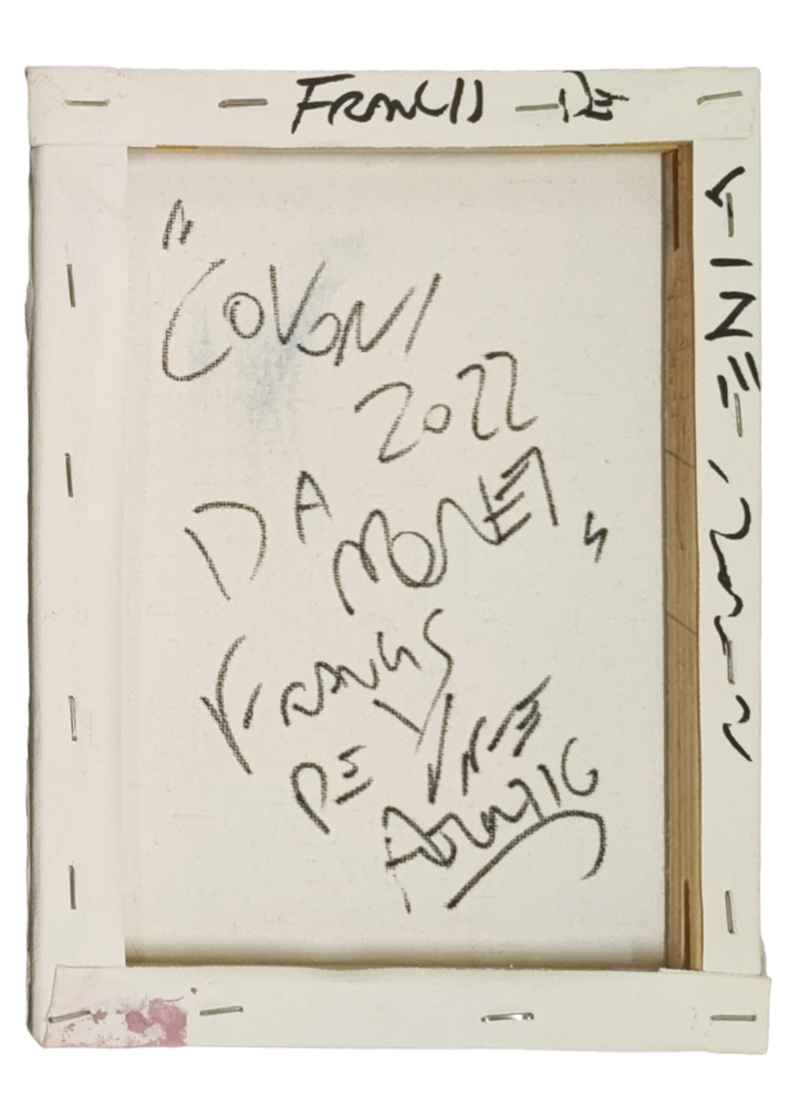Tecnica mista acrilico, smalto e intonaco su tela 18x24 cm; firma, titolo e anno al retro.