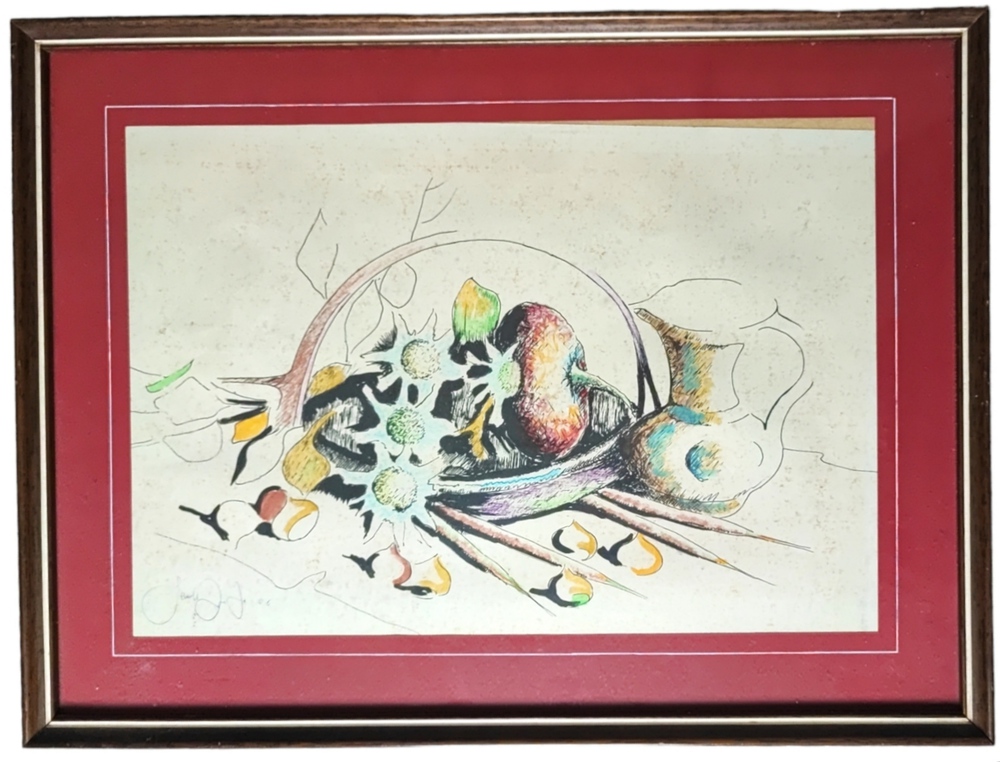 Frima non decifrata NATURA MORTA; 1986 Tecnica mista su carta 26x38 cm, firma e anno in basso a sinistra.