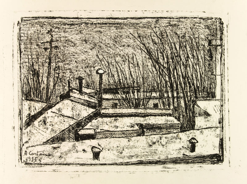 Alvaro Cartei (1911-1995). La nevicata dell'85. 1985. Monotipo mm. 440x335. Foglio: mm. 440x640. Firmato e datato. Al verso disegno a penna del soggetto usato per il ricalco. -