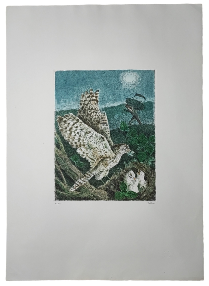 Bellini Enzo ( Novi Di Modena 1917 - Modena 2001 ) IL NIDO DEL FALCO Incisione Acquerellata 50x 70 cm foglio, 25,5x 34 lastra Firma in basso a destra, tiratura in basso a sinistra 61/100 Timbro a secco dello stampatore Il Tritone Certificato delle edizioni Bora al retro