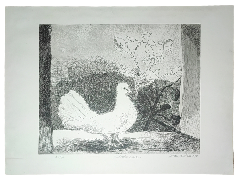 Barbaro Saverio ( Venezia 1924 ) COLOMBA E ROSE Incisione 50x70 cm; firma in basso a destra, tiratura 16/30 a sinistra.