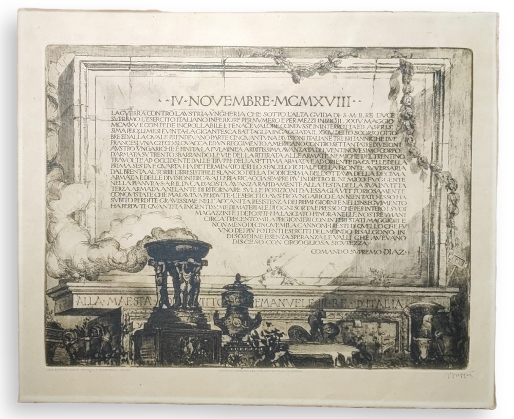Incisione d’epoca IV Novembre MCMXVIII, Comitato Lombardo Per i Soldati Mutilati in Guerra, Casa Editrice D’Arte Bestetti & Tumminelli, Milano.