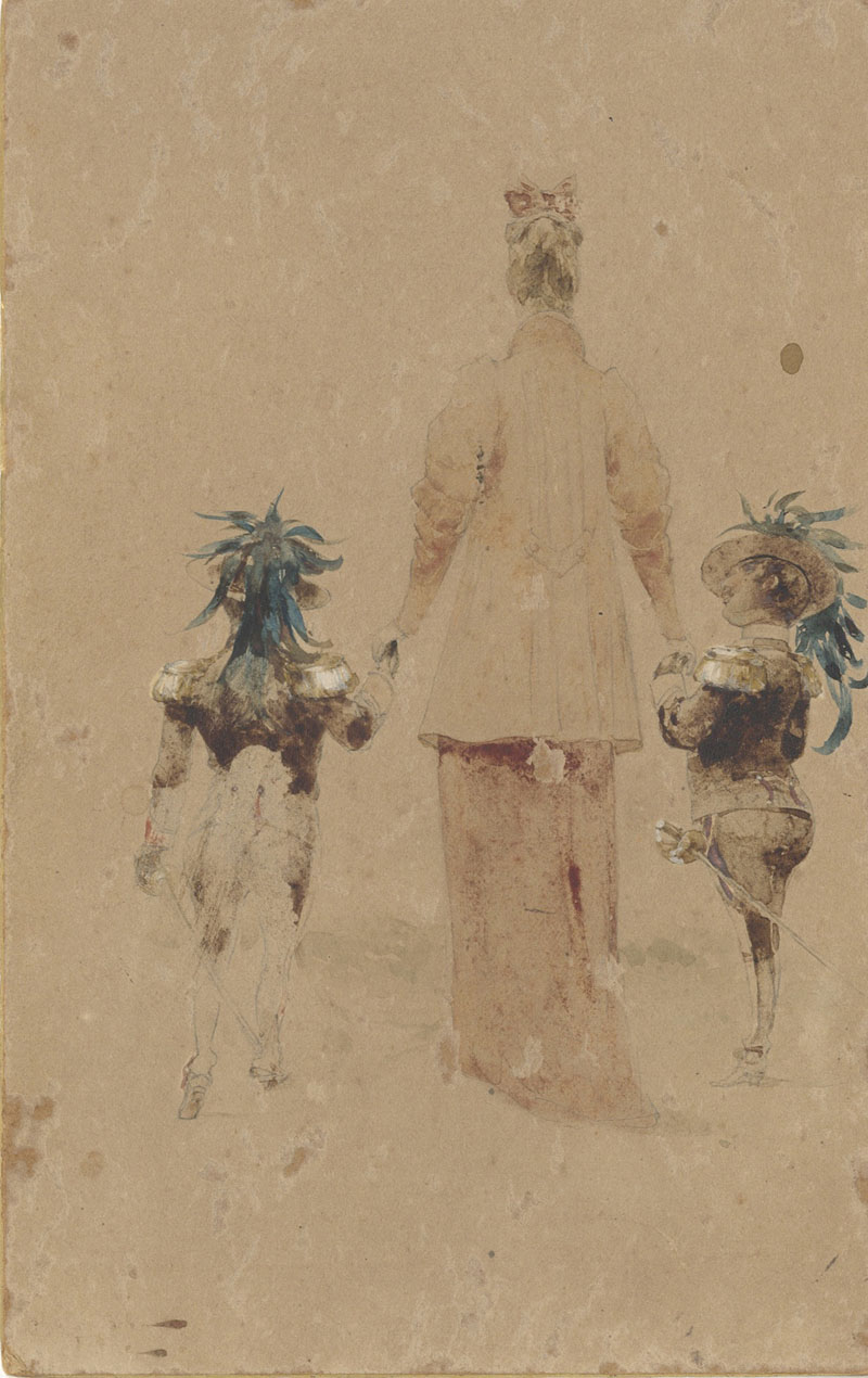 Carlo Chiostri (1863-1939). Dama con due bersaglieri per mano. Acquerello policromo, matita di grafite e rialzi a tempera bianca su cartoncino. mm 190x120. Al verso timbro della Cartoleria Egisto Sborgi di Firenze. Piccole abrasioni della carta e colori lievemente sbiaditi.